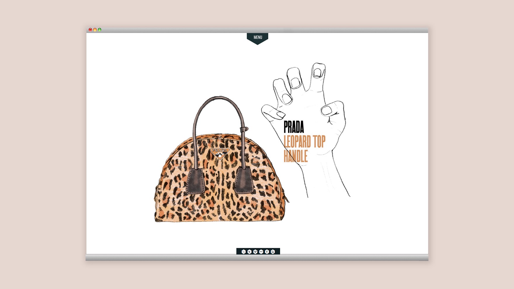 • Ilustración de una mano haciendo pose de rascado, junto con una ilustración de un bolso de leopardo de Prada, parte de la web corporativa de HANDBAGS. Diseñado por el estudio de branding y comunicación esiete y programado por sevenap.